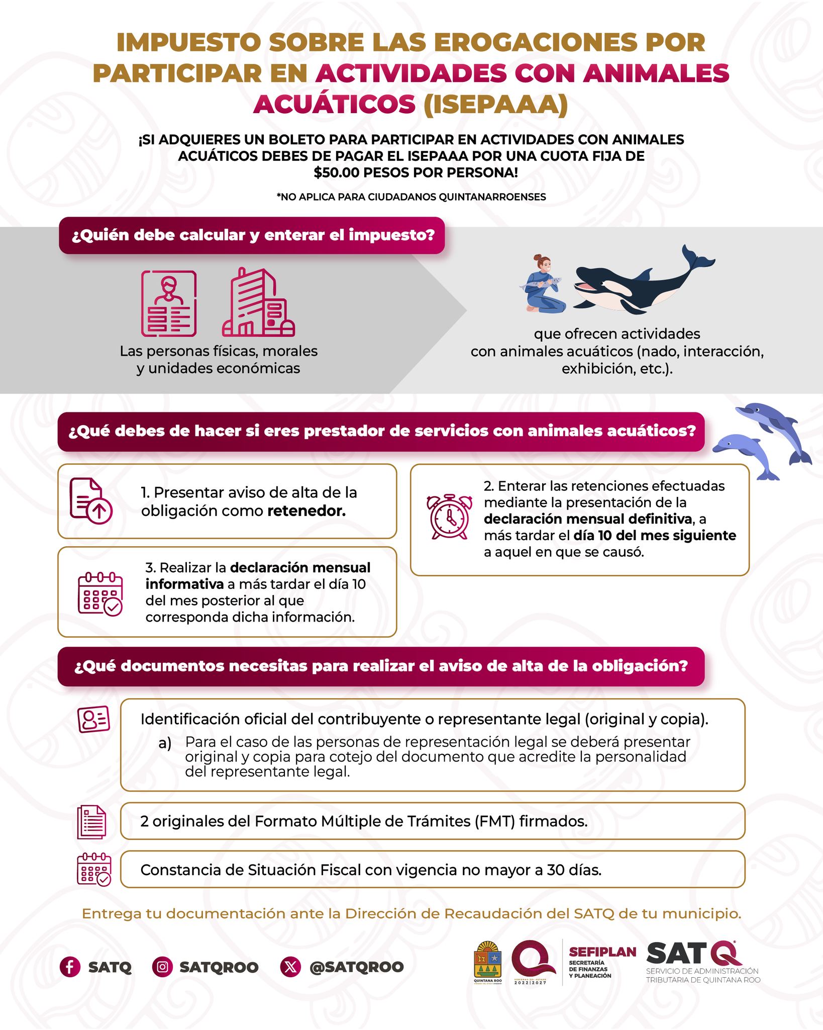 CHETUMAL.- Si ofreces actividades como nado, interacción o exhibición con animales acuáticos, recuerda que desde el 1° de mayo de 2025 debes cumplir con el Impuesto sobre las Erogaciones por Participar en Actividades con Animales Acuáticos (ISEPAAA), de acuerdo con las Reglas de Carácter General publicadas en el Periódico Oficial del Estado.