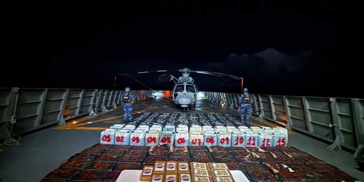 CDMX.- Durante operaciones de patrulla de vigilancia marítima, se logró el aseguramiento de aproximadamente 8.3 toneladas de presunta carga ilícita...