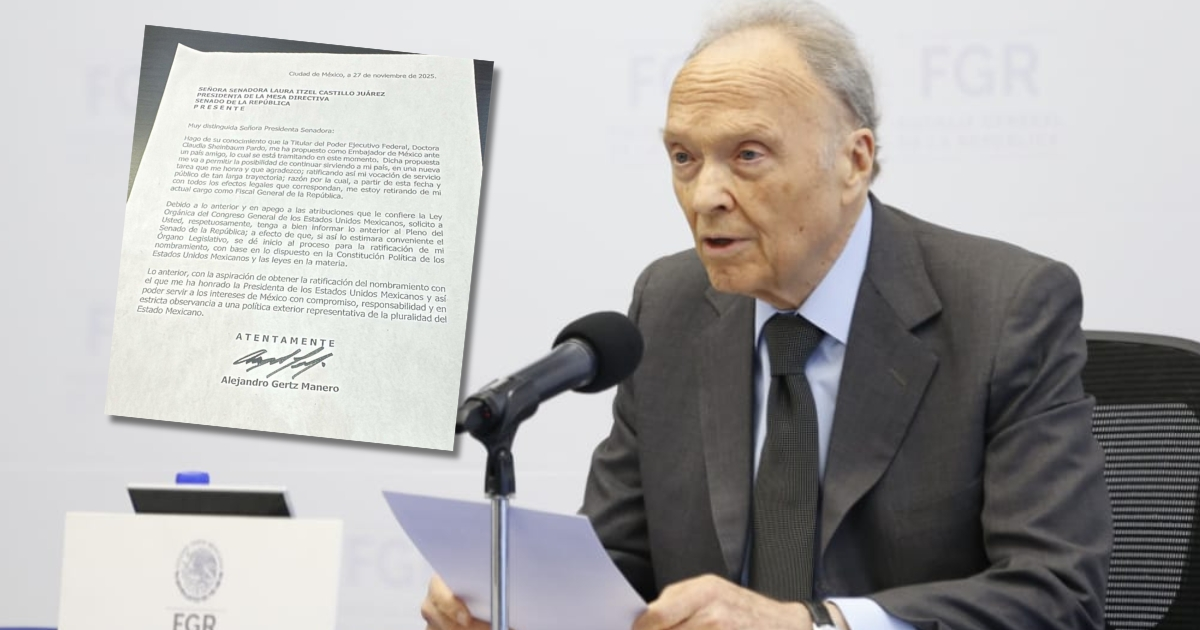 En la carta que circula en redes se dice: “Hago de su conocimiento que la Titular del Poder Ejecutivo Federal, Doctora Claudia Sheinbaum Pardo, me ha propuesto como Embajador de México ante un país amigo, lo cual se está tramitando en este momento. Dicha propuesta me va a permitir la posibilidad de continuar sirviendo a mi país, en una nueva tarea que me honra y que agradezco; ratificando así mi vocación de servicio público de tan larga trayectoria; razón por la cual, a partir de esta fecha y con todos los efectos legales que correspondan, me estoy retirando de mi actual cargo como Fiscal General de la República”.