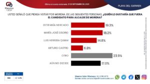 EN PLAYA DEL Carmen, el sondeo perfila un escenario claro: Estefanía Mercado -en caso de querer reelegirse- lidera con 19.3 % de respaldo interno gracias a una gestión visible y bien evaluada, seguida muy cerca por María José Osorio con 18.2 %, empujada por la estructura verde, y Luis Herrera Quiam, el secretario municipal y líder de los taxistas playenses, con 14.8 %, capitalizando su rol operativo en el municipio.