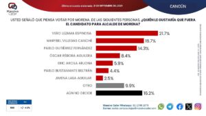 TERMINA SEPTIEMBRE Y el termómetro político de Cancún ya marca tendencias claras para el 2027. La más reciente encuesta de Massive Caller, esta semana, confirma que el verdadero juego no está en la oposición, sino en la propia casa guinda, donde Morena y aliados suman 44.5 % de intención del voto en Benito Juárez, mientras el PAN se queda con 21.6 %, el PRI apenas alcanza 10.3 %, Movimiento Ciudadano 8.3 %, en tanto el Verde y el PT sobreviven con números testimoniales. La disputa será interna y hoy dos nombres se repiten en las conversaciones: Verónica Lezama Espinosa y Pablo Gutiérrez Fernández.