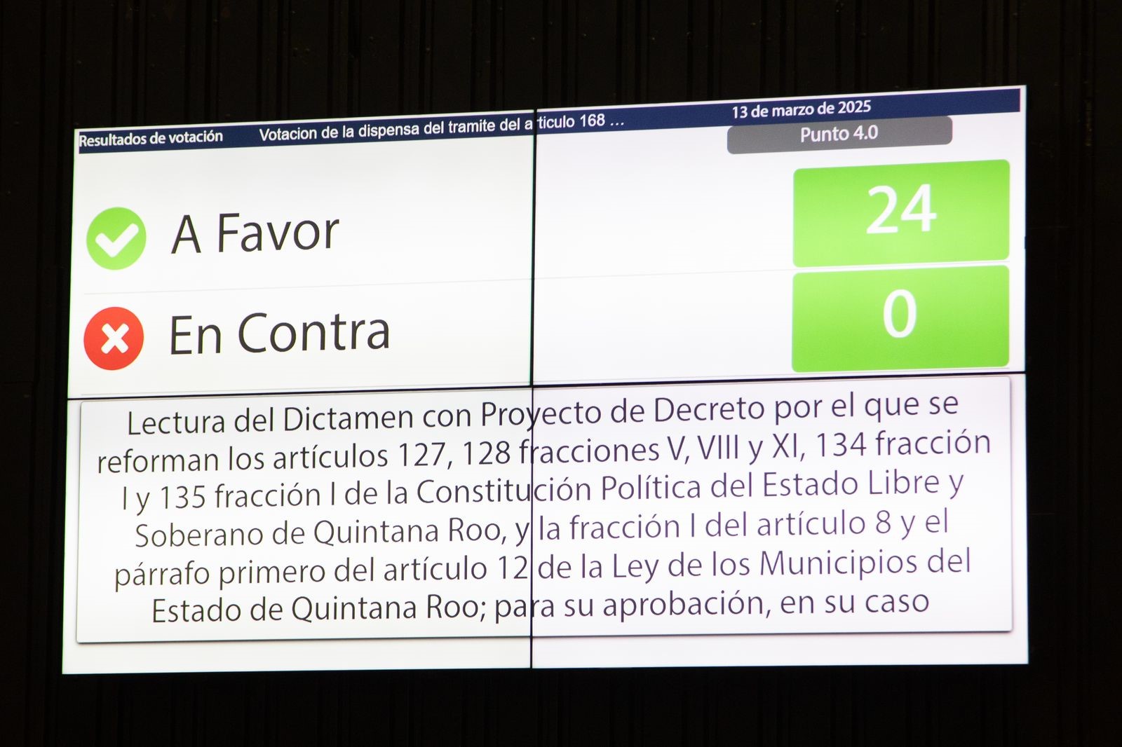 En la sesión, todas las bancadas del Congreso del Estado dieron su respaldo absoluto con un contundente 24 votos a favor y 0 en contra, en lo general y en lo particular, al Dictamen con Proyecto de Decreto que reforma los Artículos 127, 128 fracciones V, VIII y XI, 134 fracción I y 135 fracción I de la Constitución Política del Estado Libre y Soberano de Quintana Roo, y la fracción I del Artículo 8 y el párrafo primero del Artículo 12 de la Ley de los Municipios del Estado de Quintana Roo.