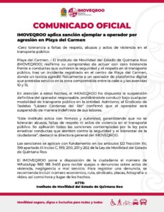 Tras revisar el caso, el Imoveqroo determinó aplicar una sanción ejemplar: el agresor no podrá volver a conducir ningún tipo de transporte público en el estado, al haber incurrido en una falta grave prevista en la Ley de Movilidad.